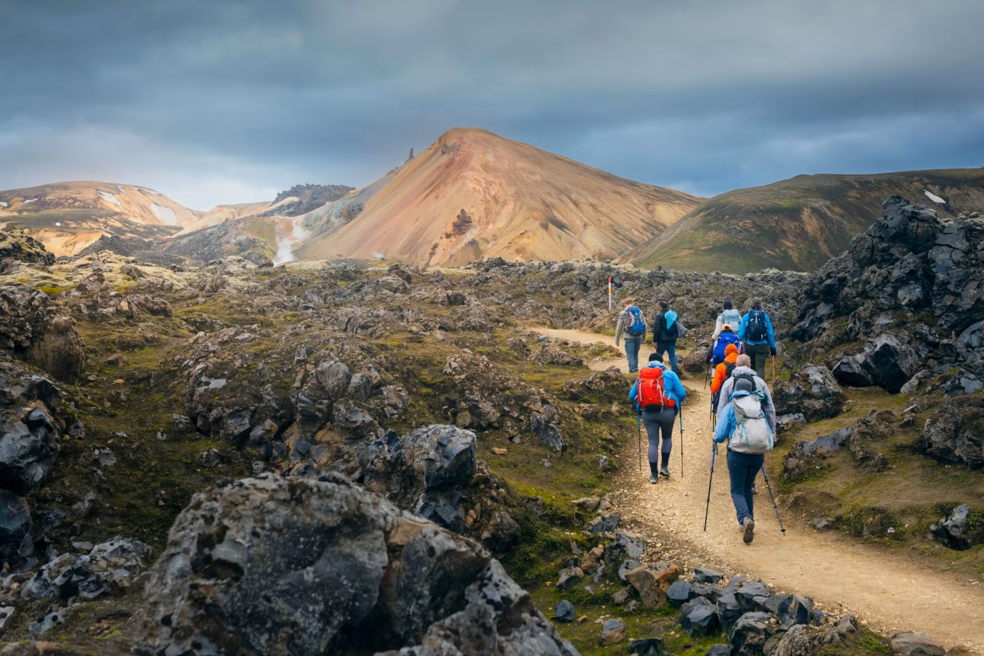 Il sentiero ci conduce attraverso piccoli canyon, sorgenti termali fumanti e creste montuose dai colori intensi. Il terreno cambia spesso sotto i nostri passi: a tratti morbido, a tratti più compatto, sempre accompagnato da vapori che emergono dal suolo.